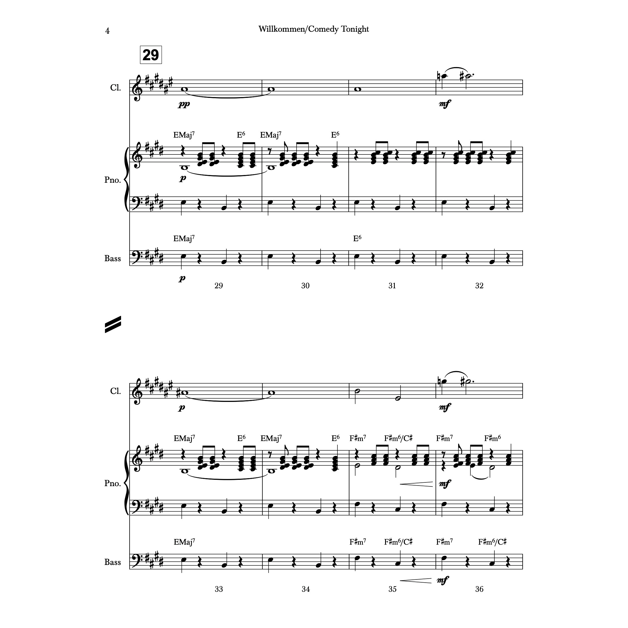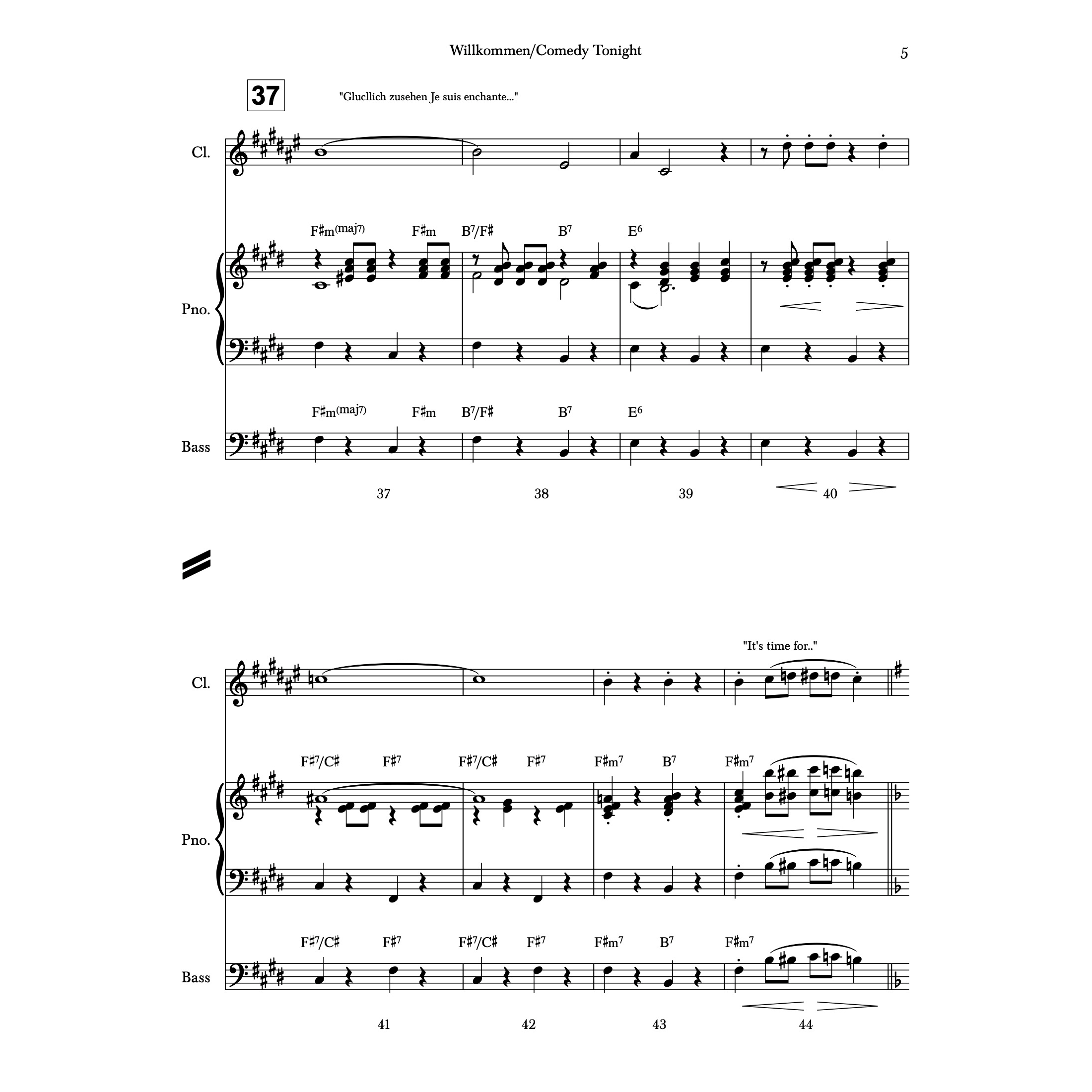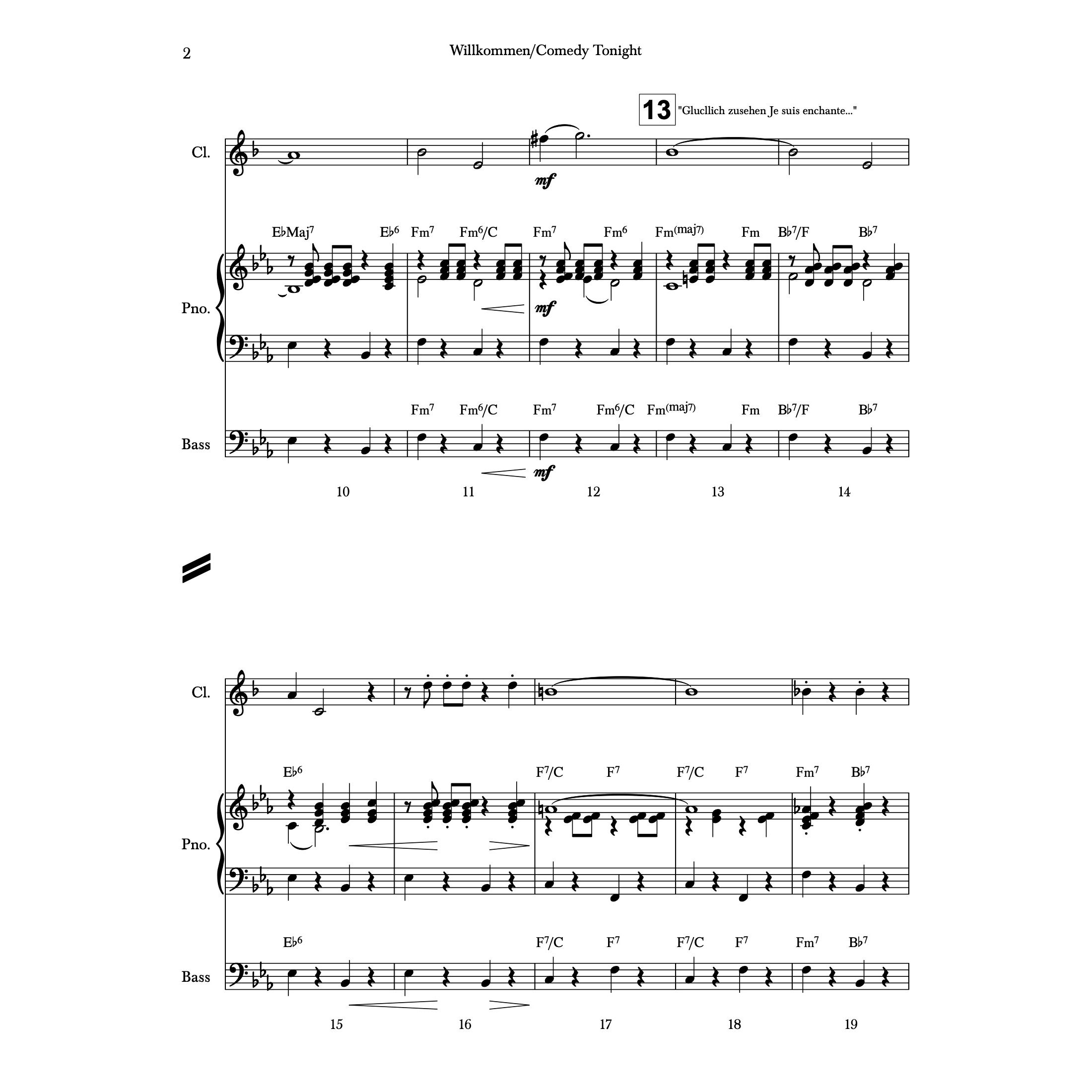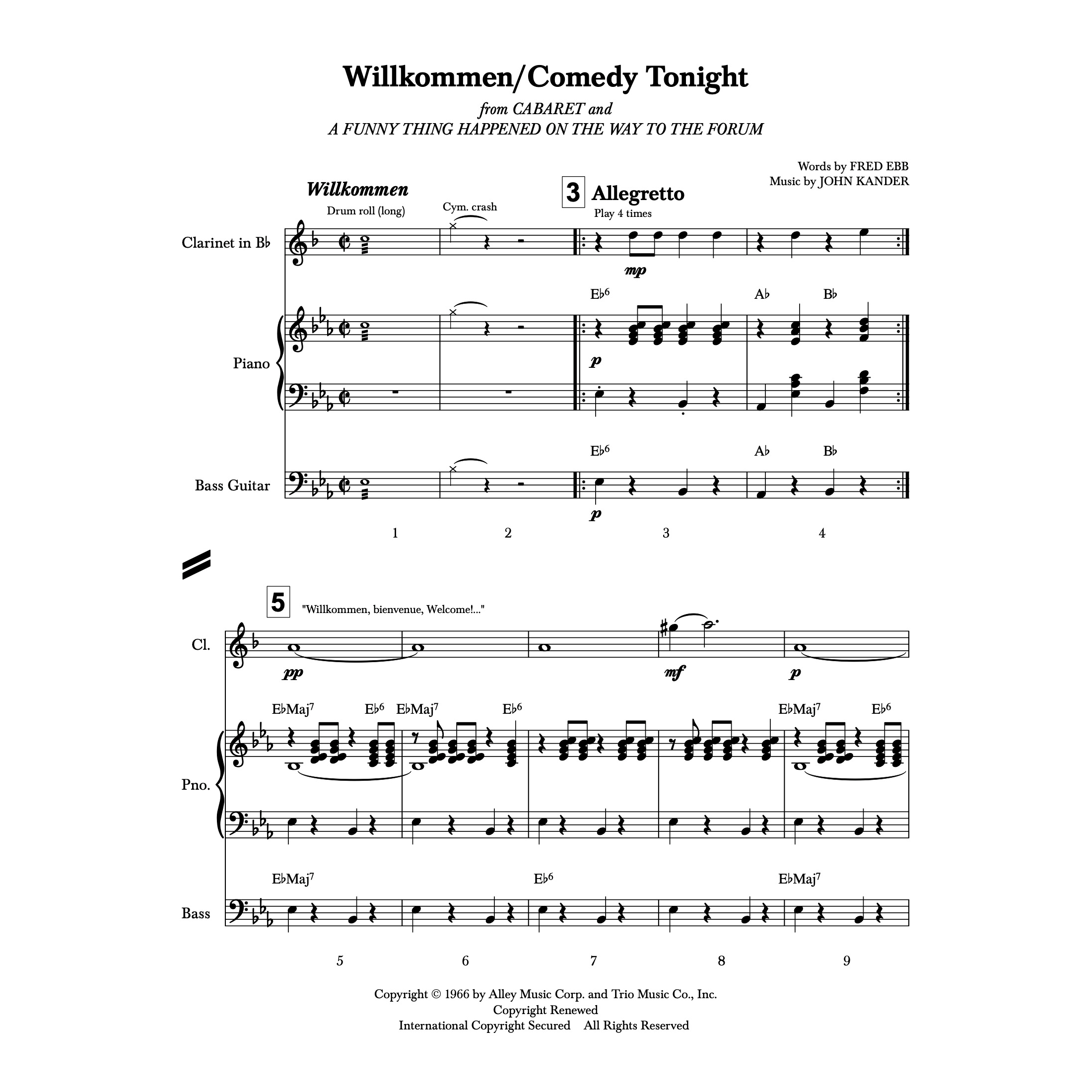 The arrangement was prepared for clarinet, piano and bass as requested. Page turns in parts, as always, were carefully considered.
