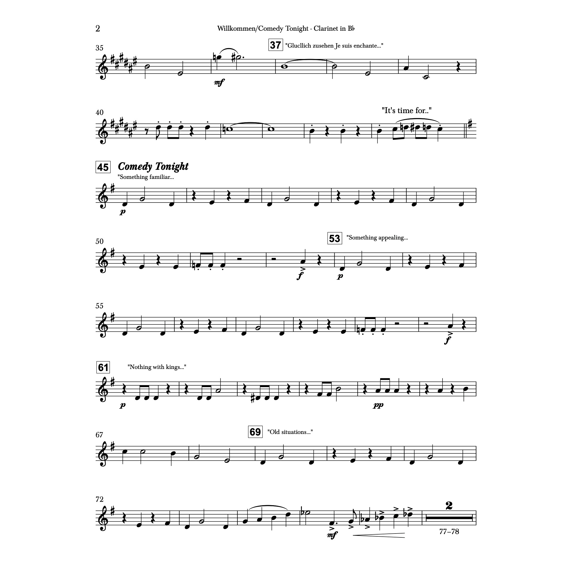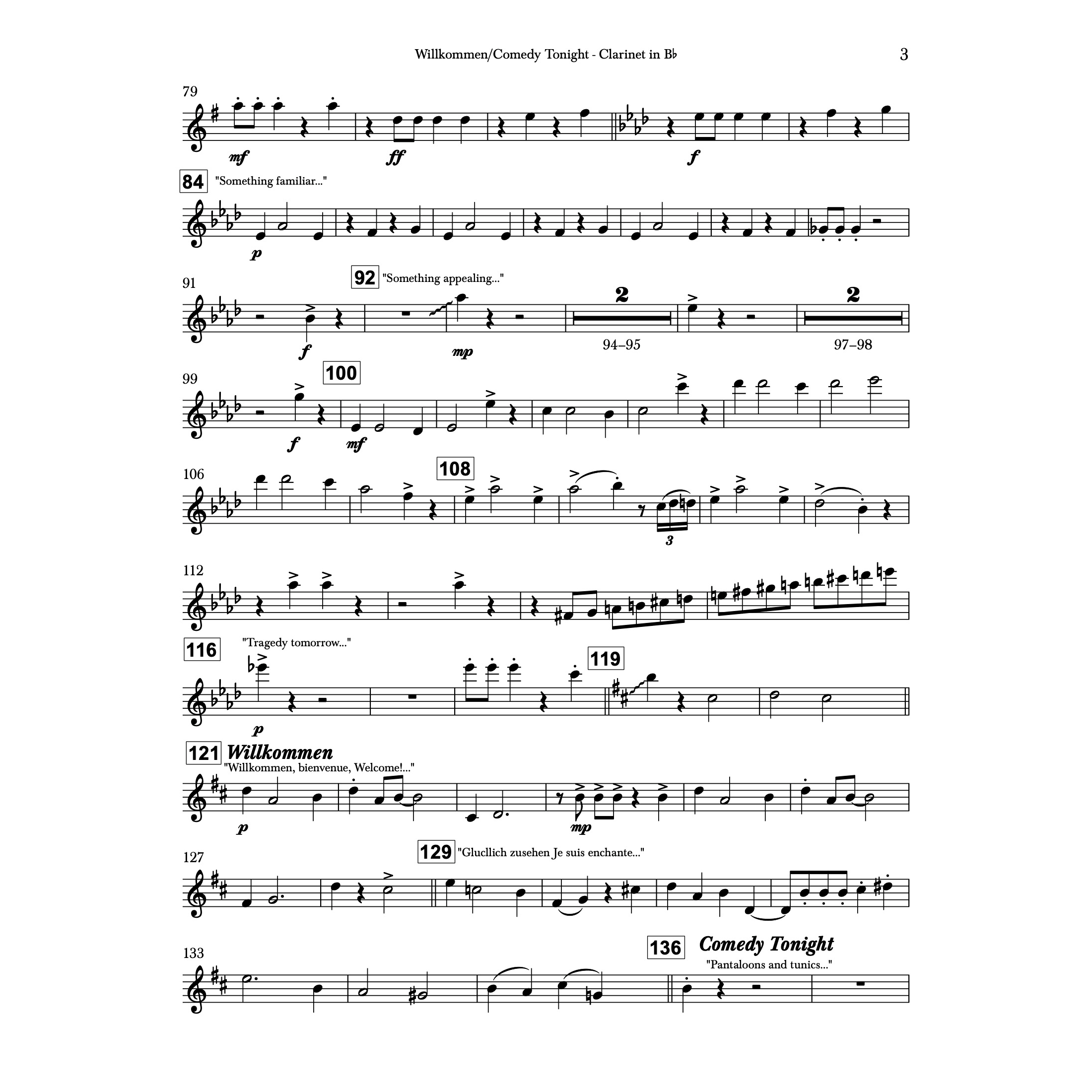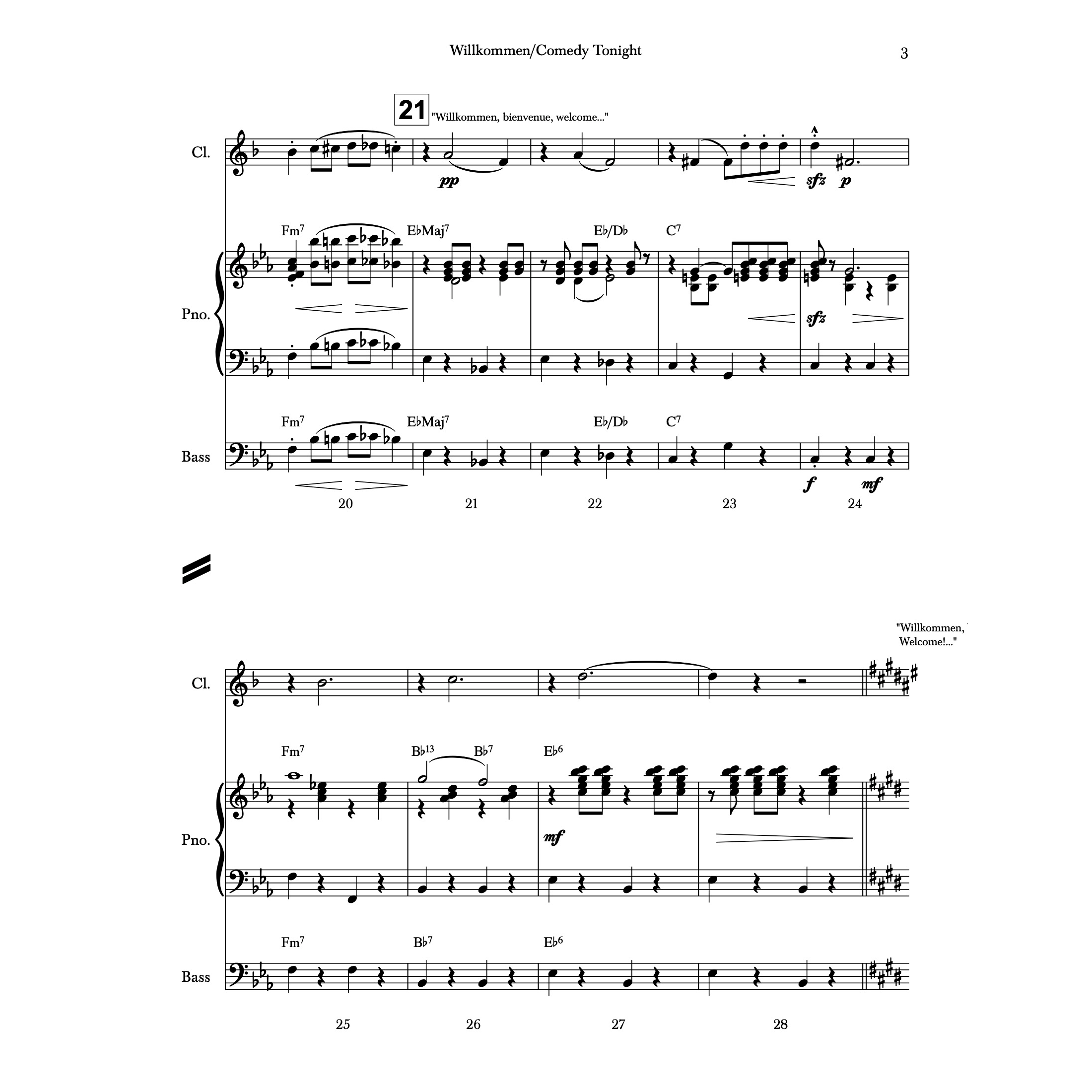 The arrangement was prepared for clarinet, piano and bass as requested. Page turns in parts, as always, were carefully considered.